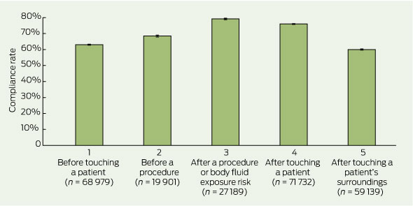Use of the HHA–WHO 5 Moments auditing tool allows HH performance to be benchmarked nationally and internationally and provides important information for targeting educational efforts. The finding that HH compliance before patient contact or performing a procedure was 10%–15% lower than compliance after patient contact is a major concern — albeit consistent with previous Australian and international studies1,2,5 — and highlights the need for focused educational efforts in this area.