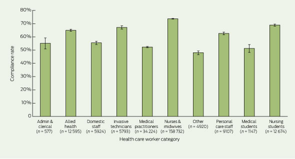 HH compliance by HCW category at the end of 2010 is shown in Box 3. The best overall compliance rates were noted for nursing staff (73.6%; 116 851/158 732). Compliance among medical staff improved only slightly from a baseline of 50.5% to 52.3% (4378/8669 v 17 897/34 224 moments; P = 0.003) — a rate that was significantly lower than that for all non-medical HCWs (70.9%, 149 919/211 469; P < 0.001). Among medical staff in states that participated for the entire audit period (SA, Tas, Vic and WA), HH compliance improved from 51.0% (4329/8496) to 54.6% (6640/12 158) (P < 0.001).