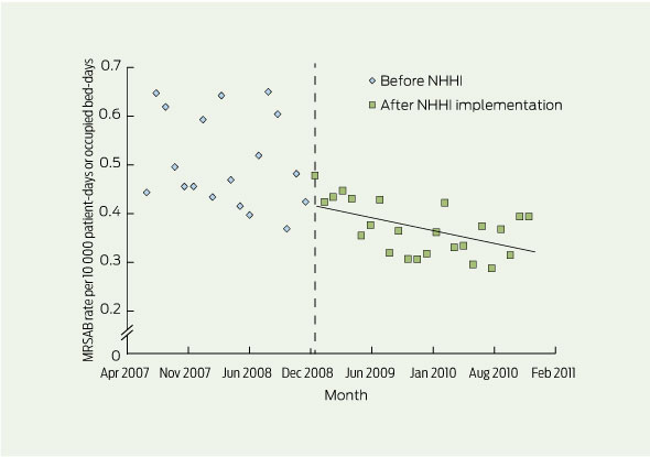 Although changes in the total MRSAB rate during 2009–2010 cannot be definitively linked to the NHHI and may be related to other factors,20,21 the general decline is consistent with reports from previous Australian and international HH culture-change programs.1-3 Based on these data, we expect to see a steady decline in the national SAB rates over the next 1–2 years as the impact of the NHHI roll-out takes effect.