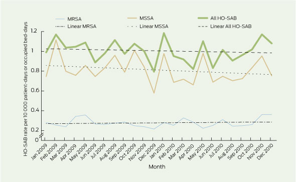 Although population-based SAB rates have been previously estimated,18,19 these do not necessarily reflect hospital activity, but can now potentially be reconciled with our data. Aside from establishing an Australian benchmark rate for MRSAB and HO-SAB, our data highlight some interesting features. First, the finding that total MRSAB rates declined significantly during 2009–2010, yet HO-MRSAB did not, suggests that SAB episodes occurring < 48 hours after admission are likely to be important. Clarification of whether these are non-inpatient health care-associated or community-acquired is likely to influence future disease prevention strategies and highlights the importance of establishing a standard national system of SAB data reporting. Second, our data suggest that about three-quarters of HO-SAB is due to MSSA rather than MRSA. Given that in 2009–2010 there were 25 738 000 acute non-psychiatric patient-days in Australian public and private hospitals,15 we could estimate from our data that there were about 1000 patient-episodes of MRSAB and about 2600 of HO-SAB nationally.