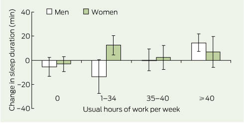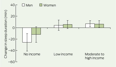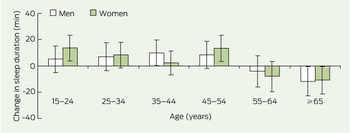 Our finding that sleep duration did not change for most Australian adults is consistent with British10 and American12 data. There may, however, be variation by country or latitude. For example, sleep duration in Finland has decreased by about 5 minutes per decade since the 1960s, and this decline is most evident in working-aged men.13 In contrast, our results suggest that decreased sleep duration is concentrated in men with no income.