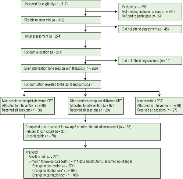 In substituting data for participants who did not complete the 3-month follow-up assessment, we assumed no change, when in fact their depression or alcohol or cannabis use may have deteriorated. This may have inflated the improvement observed in these primary outcomes. Compared with participants who completed the 3-month follow-up assessment, non-completers were not systematically different with respect to baseline depression, alcohol or cannabis use, or patterns of treatment allocation.