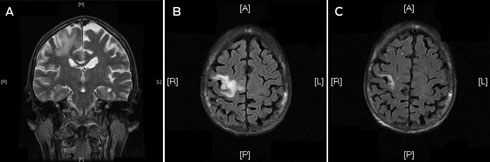 A frail 68-year-old woman of European ancestry presented to the emergency department with partial seizures of her left hand and mild left hemiparesis. Magnetic resonance imaging (MRI) scans of the brain revealed a non-enhancing lesion in the right precentral gyrus that was thought to represent infarction (Box, A and B).