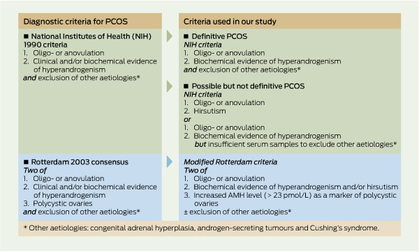 PCOS was defined using NIH 1990 criteria. Information was available on the presence of (i) self-reported menstrual dysfunction; (ii) hyperandrogenaemia; and (iii) exclusion of other disorders.3 Menstrual dysfunction was considered present for women with oligomenorrhoea. Hyperandrogenaemia was defined as a circulating free testosterone level > 34.2 pmol/L (the 95th percentile for a group of women known to be free of PCOS whose samples were assessed on the same machine with the same assay as our study). Although hirsutism was self-reported as excess hair on the chin, lip, chest or abdomen, this was not used as a diagnostic criterion because it was not assessed objectively by a trained rater.