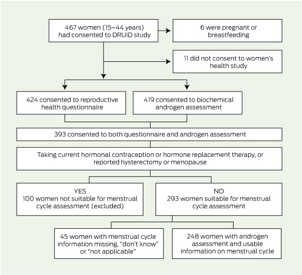 The selection of study participants is shown in Box 2. Of 461 women, 424 (92.0%) answered the questionnaire, 419 had androgen levels measured (90.9%), and 393 (85.2%) completed both the questionnaire and had androgen levels measured. Based on estimated resident population figures at June 2004,17 our participants represent at least 13%–14% of the eligible women in this age group living in a defined region of Darwin.