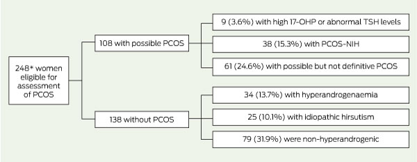 The remaining women were categorised as shown in Box 3 hyperandrogenaemia, 34 (13.7%); idiopathic hirsutism, 25 (10.1%); non-hyperandrogenic, 79 (31.9%); abnormal 17-OHP/TSH values, 9 (3.6%); and possible but not definitive PCOS, 61 (24.6%). The majority of the latter group (n = 53) had possible PCOS by the modified Rotterdam criteria. Two additional women with insufficient serum for measurement of AMH level (one with a free testosterone level of > 34.2 pmol/L, regular cycles and hirsutism, and the other with hirsutism only) could not be allocated to the above groups.