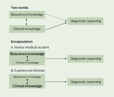 The mechanism most widely discussed in the research literature by which bioscience knowledge might develop clinical expertise concerns diagnostic reasoning. This cognitive process has been investigated over the past few decades, and two differing theories have been proposed to describe the role of bioscience learning in the development of clinical reasoning skills — the “two-worlds” model8 and the “encapsulation” model9 (Box 2).