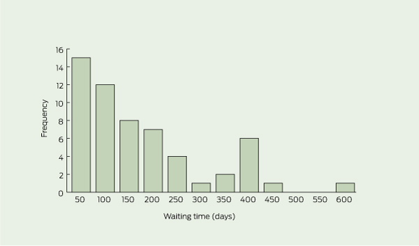 Median, ranges, and interquartile ranges for waiting time information based on region, funding and IASP classifications are presented in Box 2. Box 3 shows the frequency distribution of waiting times and demonstrates that the distribution was skewed (Shapiro–Wilk statistic, 0.845; P < 0.001). The waiting time for initial assessment for a new persistent pain outpatient referral was less for privately funded services (mean rank, 14.7) than publicly funded (mean rank, 35.7) or combination funded services (mean rank, 35.5; Kruskal–Wallis H(df, 2) = 19.5; P < 0.001).