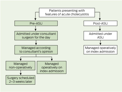 Design, setting and participants: A retrospective study of medical records for patients presenting to Nepean Hospital with acute cholecystitis during the 2 years before and 2 years after introduction of an ASU in November 2006.