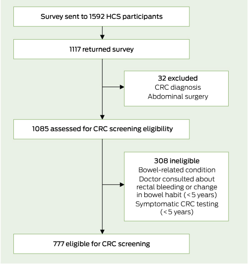 Of the 1592 mailed surveys, 1117 respondents completed and returned a survey (response rate, 70%). Twenty-four respondents previously diagnosed with CRC and eight reporting they had undergone major abdominal surgery were excluded from analysis, leaving a total sample of 1085 participants with data. A total of 777 participants were deemed asymptomatic and eligible for CRC screening analysis (Box 2). Sociodemographic characteristics of asymptomatic people are presented in Box 3.