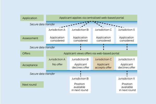 A single entry and exit point model meets all of these requirements (Box). This would involve the development of an online “shopfront” portal, managed by a national coordinating body. Applicants would submit one application based on an agreed minimum set of data, and could apply for an internship in as many, or as few, jurisdictions as they wish. Dates and timing of offers would be nationally consistent, but individual jurisdictions would retain responsibility for matching candidates to specific health services. This would require the secure transfer of selected applicant data between national and state-based back-of-house systems. Applicants would receive up to one time-limited offer per jurisdiction, but would be able to accept only a single position nationwide. Subsequent rounds of offers would follow for unmatched candidates.