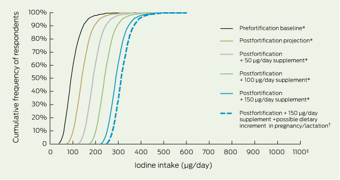 We used the proportion with intakes less than the estimated average requirement (EAR; Box 1) to estimate the proportion of the population with inadequate iodine intakes.21 Supplementation with 100 μg of iodine per day would result in the proportion of women with intakes below the EAR for pregnant women (160 μg/day) being essentially zero, and fewer than 10% of women having intakes below the EAR for lactating women (190 μg/day). Both of these values would be zero with supplementation with 150 μg of iodine per day. Median iodine intakes would be 240 μg/day with supplementation of 100 μg/day and 290 μg/day with supplementation of 150 μg/day (Box 3). The highest iodine intake resulting from bread fortification plus supplementation with 150 μg of iodine per day would be about 580 μg/day (Box 3), which is well below the upper level of intake of 1100 μg/day for adults in Australia and New Zealand2 (Box 1).