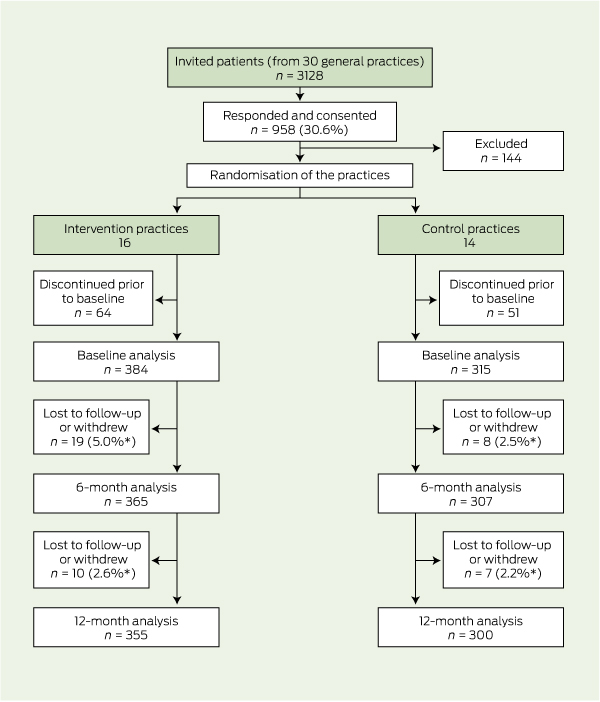 A total of 3128 patients from the 30 participating practices were approached to participate in the study, and 958 consented. Of these, 144 patients were excluded (two died, 84 had diabetes or cardiovascular disease, 35 left the practice, 13 had a terminal or other illness, and we had an incorrect address for 10). There were 814 remaining patients (26.0% of invited patients) from all 30 practices, 16 of which were intervention practices (including eight rural) and 14 of which were control practices (including six rural). These practices had similar numbers of GPs (intervention, 3.7; control, 2.8), practice nurses (0.6; 0.7), and practice managers (0.8; 0.8). After randomisation, a further 115 patients were lost to follow-up or withdrew before the baseline data collection, leaving 699 participants — 384 in the intervention group and 315 in the control group (Box 1). Those subsequently lost to follow-up or who withdrew were slightly more likely to be overweight (P = 0.04) but were otherwise similar to those completing the study, and there were no significant differences between intervention and control groups for these patients.