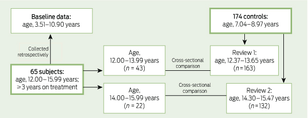 For the controls, we used data from boys participating in the Nepean longitudinal study, an observational study originally designed to investigate the effects of birth size, body size and genes on blood pressure and bone mass.3-5 All were born at Nepean Hospital in western Sydney between 1989 and 1990 and had height and weight measurements available at 7–8 years of age and from one or both reviews at 13 and 15 years of age, when self-reported Tanner pubertal staging was also recorded.5
