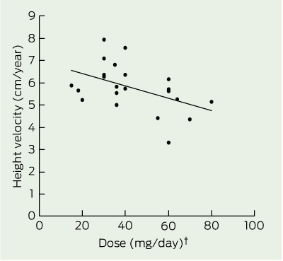 Results: Sixty-five subjects were recruited; mean duration of treatment was 6.3 ± 1.9 years. At baseline, their growth parameters were not significantly different from those of the controls after adjusting for age. Compared with the controls, after adjusting for current age and baseline growth parameter z score, subjects aged 12.00–13.99 years had significantly lower weight and body mass index (P < 0.01), and those aged 14.00–15.99 years had significantly lower height and weight (P < 0.05). At 12.00–13.99 years of age, the subjects were comparable to the controls in their pubertal development adjusted for age, but those aged 14.00–15.99 years reported significant delay (mean Tanner stage, 3.6 for subjects v 4.0 for controls; P < 0.05). The dose of medication was inversely correlated with the height velocity from baseline to 14.00–15.99 years of age (P < 0.05).