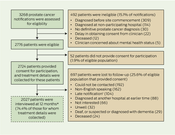Design, setting and patients: Men who were diagnosed with prostate cancer at 11 public and six private hospitals in Victoria from August 2008 to February 2011, and for whom prostate cancer notifications were received by the Prostate Cancer Registry.