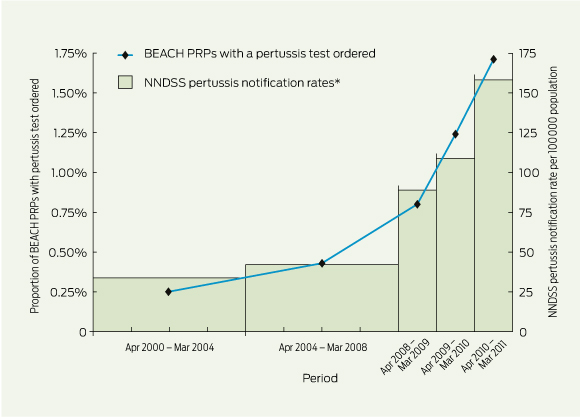 Design and setting: Analysis of Australian general practice encounter data (from the Bettering the Evaluation and Care of Health [BEACH] program) on 13 “pertussis-related problem” (PRP) codes that were most likely to result in a pertussis laboratory test request and Australian pertussis notifications data (from the National Notifiable Diseases Surveillance System [NNDSS]) for the period April 2000 to March 2011.