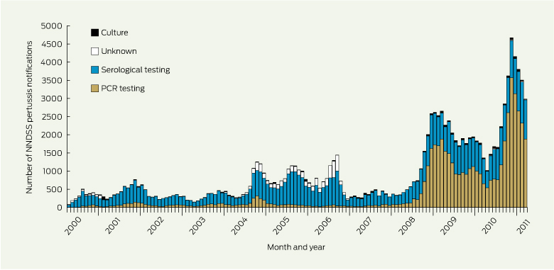 In recent years, rates of pertussis notifications have increased dramatically across Australia and in many other parts of the world.3-6 The rise has been seen in all Australian states and territories, with the highest notification rates in children aged under 15 years.7 Although increased notifications may be due to a true increase in circulating B. pertussis, it is possible that the magnitude of the increase has been amplified by better recognition of disease and more frequent testing.8