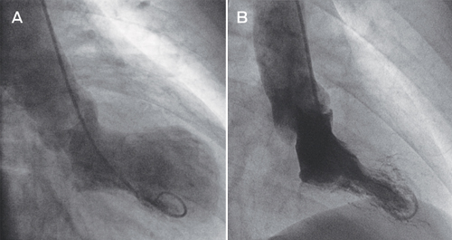 Selective coronary angiography revealed no significant coronary artery stenosis. Left ventriculography demonstrated left ventricular systolic dysfunction with severe hypokinesis and apical ballooning (Box, A). Transthoracic echocardiography confirmed the left ventriculography findings. There was no evidence of myocardial infarction on cardiac magnetic resonance imaging. We made a diagnosis of takotsubo cardiomyopathy.