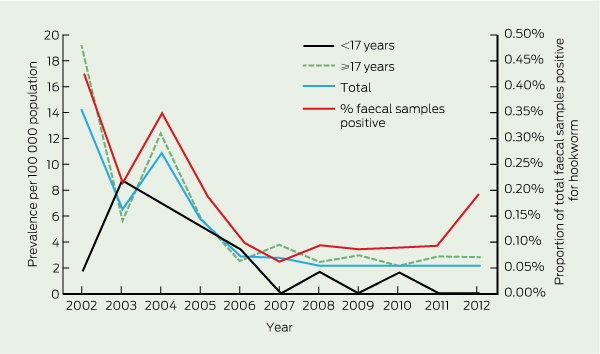 Some cases of HWI may have been missed, as data were not available from two providers of pathology services to the NT. Nevertheless, for notifiable diseases in the NT such as hepatitis B, the government and Western Diagnostic Pathology laboratories data capture over 90% of diagnoses.16 We believe it is a reasonable assumption that this will also be the case for HWI. Patients residing in remote areas were well represented in the study population, and annual numbers of faecal microscopy testing were relatively constant over the 10 years. Thus, we are confident that the consistent downward trend in prevalence demonstrated by our data reflects a reduction in the true rate. Finally, although we have shown that most patients with HWI in the NT had anaemia and/or eosinophilia, community controls were not available for comparison to support a causative association.