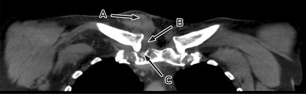 Despite ongoing cephazolin therapy, the patient developed increasing pain over the right sternoclavicular joint. Computed tomography imaging demonstrated changes consistent with a joint effusion, localised oedema, septic arthritis and osteomyelitis of the upper manubrium and medial right clavicle (Box 2). After initial conservative management without symptom resolution, surgical debridement was performed, and culture of the excised tissue grew MDR E. coli. The patient subsequently complained of lumbar back pain, and MRI of the lumbar spine showed changes consistent with an epidural abscess together with immediately adjacent discitis and osteomyelitis at the L4–5 vertebrae (Box 3). An orthopaedic consultation recommended conservative management, and the patient’s primary care was transferred to infectious diseases physicians. After 5 weeks of intravenous cephazolin therapy in hospital, he was discharged with a treatment regimen of intravenous ceftriaxone 2 g daily delivered by an elastomeric infusion device (Baxter) managed by the home-based acute care service.