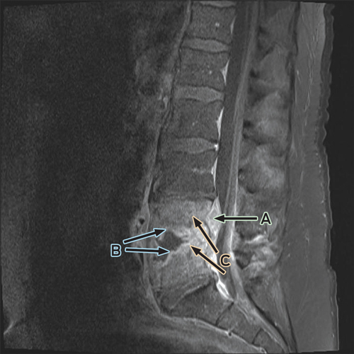 The patient was readmitted the day after discharge with increasing abdominal pain and continuing back pain. Repeat MRI of the lumbar spine showed slight radiological progression. The ceftriaxone dose was increased to 2 g twice daily, with ongoing conservative management of the spinal osteomyelitis. At the end of this second long-term admission (47 days), the patient had made significant clinical improvement and was discharged for ongoing outpatient-based rehabilitation, with a regimen of oral fosfomycin 3 g daily. In total, he received 10 weeks of intravenous antibiotics and 8 weeks of oral fosfomycin.