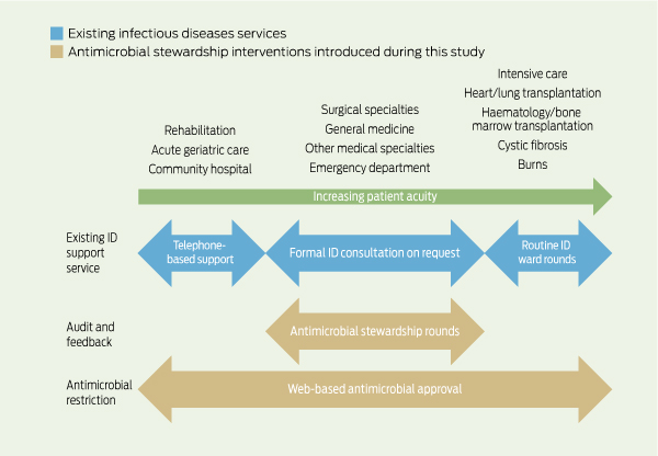Up to 50% of antimicrobial agents prescribed to hospital inpatients are considered to be inappropriate,1,2 and this excess use has been associated with increased mortality, adverse drug reactions and the development of resistant bacteria.3,4 The Australian Commission on Safety and Quality in Health Care recently published recommendations for hospital-based antimicrobial stewardship programs.2 A variety of approaches are available to implement these recommendations, including dissemination of guidelines, education, restricting antimicrobial availability and postprescribing audit and review.