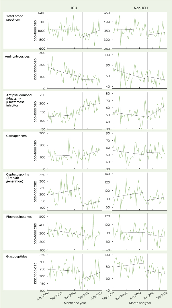We compared trends in the rate of use of antimicrobial classes before stewardship implementation (January 2008 to December 2010) and after implementation (January 2011 to June 2012). Antimicrobial consumption quantities were converted into defined daily doses (DDD) per 1000 occupied bed-days (OBD) as part of the National Antimicrobial Utilisation Surveillance Program.7,8 Total broad-spectrum antimicrobial use was defined as the sum of usage for all classes except for aminoglycosides, which are regarded as narrow-spectrum antibiotics. Antimicrobial use is based on pharmacy purchasing data and inpatient stock distribution (excluding hospital in the home and the emergency department). Outcomes were assessed by: