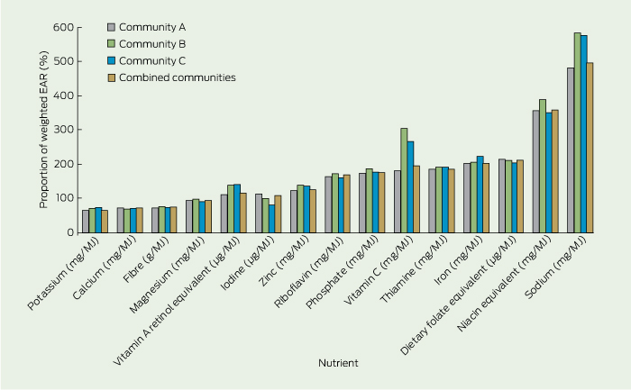 With reference to weighted EARs (or AIs) per 1000 kJ and nutrients measured, in all three communities the diet was insufficient in calcium, magnesium, potassium and fibre (Box 3). Iron, vitamin C and folate equivalents were all around double the weighted EAR per 1000 kJ and niacin equivalents were nearly four times the EAR (Box 3). Sodium was the nutrient provided in the greatest excess, at nearly six times the midpoint of the average intake range (Box 3). Most nutrient density values appeared lower in community A compared with communities B and C (Appendix 4).