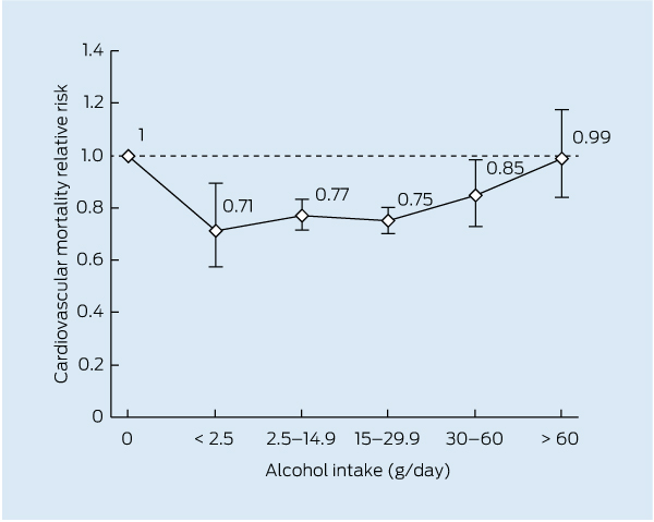 The evidence for a J-shaped relationship between alcohol consumption and cardiovascular outcomes is extensive. The possibility that the shape of the curve may be due simply to a misclassification of drinking habits, as suggested in the 2009 NHMRC guidelines, has not been supported by recent studies. The overall impact on community health of a 20%–30% lower rate of coronary disease in light to moderate drinkers is likely to be substantial.30 While the J-shaped curve complicates the formulation of public policy on alcohol,31 it cannot be dismissed.