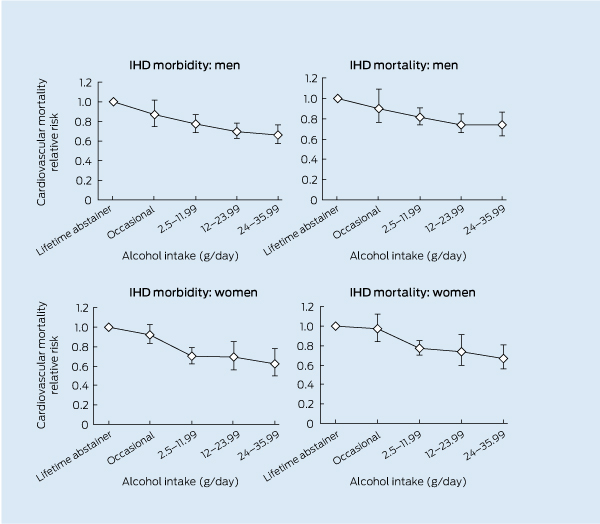 In stating that “some recent studies have found no significant cardioprotective or all-cause associations”, the 2009 NHMRC report relied on a 2006 meta-analysis by Fillmore and colleagues9 and an expansion of their views in a 2007 review.18 Their meta-analysis presented a reinterpretation of previous studies, developing and expanding the “sick quitter” hypothesis first developed in 1988 by Shaper and colleagues.19 This interpretation broadly proposes that misclassification of drinking habits may have resulted in more coronary events in the abstainer reference group because it included ex-drinkers with an increased cardiovascular risk because of ill health or increasing age. The sick quitter hypothesis was criticised in several studies carried out during the 1990s. Fillmore and colleagues re-examined the hypothesis using their own methodology to exclude all studies with misclassification errors in the abstainer reference group. However, they took such a strict approach that they identified only seven studies on total mortality and two on coronary heart disease mortality free of the misclassification errors. In this small number of studies, the evidence base remaining failed to confirm the J-shaped relationship between alcohol consumption and cardiovascular events. The conclusion from their analysis was that “future prospective studies should use far greater precision in their assessment of drinking behavior and abstinence”.18 Recent studies confirm the suspicion that that there is indeed a difference between former drinkers and lifetime abstainers in their pattern of ischaemic heart disease (IHD) incidence and mortality, but no evidence that this differentiation makes a substantive difference to the relationship between lower levels of cardiovascular events with a low to moderate intake of alcohol.20 While it is possible that younger adults with a disability may choose an abstinent lifestyle and suffer a higher mortality in adulthood from their disability and not their abstinence, this accounts for only a very small proportion of non-drinkers and is unlikely to contribute substantially to the J-shaped relationship.21