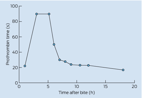 He presented to hospital 40 minutes after the bite. On examination, he was alert but pale and diaphoretic, with a blood pressure level of 170/100 mmHg and a heart rate of 70 beats/min. He had puncture wounds on the third and fourth fingers of his right hand. There was no evidence of bleeding, including at mucous membranes and the bite site. Results of his neurological examination were normal and he had no myalgia. His urine tested positive for blood. Results of his initial blood tests were: haemoglobin, 142 g/L (reference interval [RI], 130–170 g/L]; platelet count, 116 × 109/L (RI, 150–400 × 109/L); white cell count, 8.0 × 109/L (RI, 4.0–11.0 × 109/L); prothrombin time (PT), 22 s (RI, < 11 s); activated partial thromboplastin time (aPTT), 51 s (RI, < 32 s); fibrinogen, 0.7 g/L (RI, 1.6–3.4 g/L); fibrinogen degradation products, 320–640 mg/L (RI, < 10 mg/L); creatinine, 80μmol/L (RΙ, 50–120μmol/L); creatine kinase (CK), 86 U/L (RI, < 200 U/L); and lactate dehydrogenase, 180 U/L (RI, < 230 U/L).