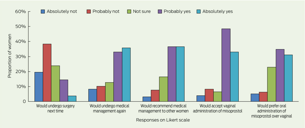 When asked if they would recommend medical management of miscarriage to other women, 73.0% (116/159) indicated that they would, while 18.2% (29/159) indicated that they would undergo surgery next time. Patient satisfaction is reported with Likert scales in Box 4.
