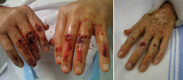 The medical record review revealed similar mechanisms of injury. Patients over-tilted their mobile garbage bins to reduce the pushing or pulling force required to move them. If the weight of the bin exceeded the strength of the patient, especially on a downward slope, the mobile garbage bin pulled away from the patient. Patients typically fell while still gripping the bin handle. When the mobile garbage bin reached a horizontal position, the skin dorsal to the flexed PIP joints was the first structure to come into contact with the ground. The continued horizontal momentum of the bin then caused an abrasion to the dorsum of the PIP joint with associated injuries to underlying bone and soft tissue structures (Box 1). The most consistently described mechanism involved the bin “getting away” or “sliding from under” the patient, followed by abrasion of the hands on the ground under the bin.