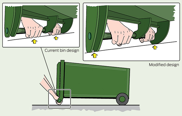 Launceston City Council provides assistance for older or disabled people who are having difficulty handling their mobile garbage bins.6 Some of these injuries could be prevented if other local governments adopted a similar service, or increased the frequency of garbage collections to reduce the weight of bins.