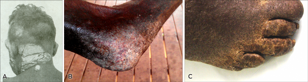A: Photograph of crusted scabies reproduced from a 1948 case report.1 B: Crusted scabies of the elbow. C: Crusted scabies of the foot (partially treated).