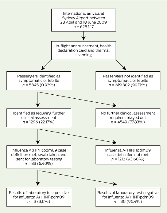 During the DELAY and CONTAIN phases of pandemic (H1N1) 2009 influenza, New South Wales Health conducted, at the request of the Australian Government, screening of passengers at Sydney Airport. The aim was to delay entry and minimise spread of the pandemic in Australia.1,2 In this study, we examined the effectiveness of this intervention, in order to inform its future use at the state and national level.