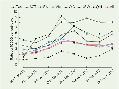 A second important limitation lies with the differences in the types of hospitals included. However, this limitation is reduced by restricting the analyses to public hospitals and using number of patient-days to calculate rates. Nevertheless, as the rates reported here do not take into account the different casemix of hospitals in each state or territory, comparison of rates between states and territories should be interpreted with caution. The study analysed aggregate rather than individual-level data, therefore important confounders (eg, comorbidity) that are not reported to the surveillance programs could also not be taken into account. Further, there was variation in the denominator data, with some jurisdictions using patient-days and others using occupied bed-days. However, the yearly variance between these was estimated to be less than 1%, although the monthly variance can be greater, particularly in small hospitals.15 In addition, all contributors except WA excluded patients aged < 2 years from the denominator. However, the 0–4-years age group accounts for less than 4% of hospital separations of all types in Australia, and inclusion of < 2-year-olds in the denominator is unlikely to substantially affect the results or alter the conclusions of this study.14