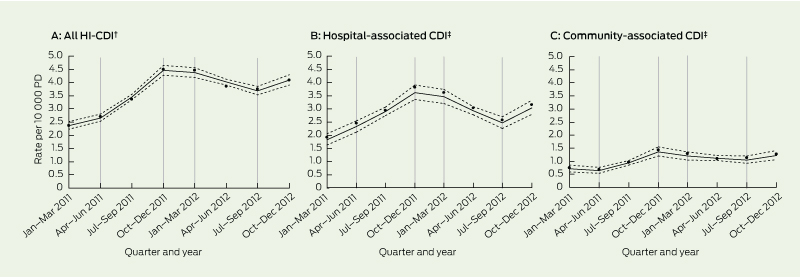 Results: The annual incidence of HI-CDI increased from 3.25/10 000 patient-days (PD) in 2011 to 4.03/10 000 PD in 2012. Poisson regression modelling demonstrated a 29% increase (95% CI, 25% to 34%) per quarter between April and December 2011, with a peak of 4.49/10 000 PD in the October–December quarter. The incidence plateaued in January–March 2012 and then declined by 8% (95% CI, 11% to 5%) per quarter to 3.76/10 000 PD in July–September 2012, after which the rate rose again by 11% (95% CI, 4% to 19%) per quarter to 4.09/10 000 PD in October–December 2012. Trends were similar for HA-CDI and CA-CDI. A subgroup analysis determined that 26% of cases were CA-CDI.