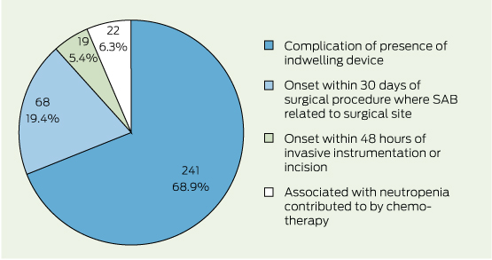 Of the 350 HA-SAB infections that were identified ≤ 48 hours after hospital admission, most (68.9%) were reported as a complication of the presence of an indwelling medical device; 19.4% occurred within 30 days of a surgical procedure and were related to the surgical site. Smaller numbers of infections were reported in association with invasive instrumentation or in the setting of neutropenia contributed to by cytotoxic therapy. Associated key clinical criteria are summarised in Box 2.