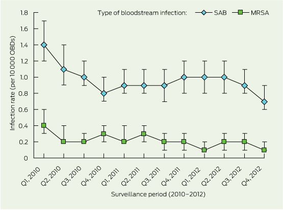 Results: Data from 119 public and four private hospitals were analysed. The cumulative aggregate SAB infection rate was 1.0/10 000 OBDs (95% CI, 0.9–1.0/10 000 OBDs). Overall, 1335/3205 SAB infection events (41.7%) were health care-associated. Of these, 26.2% occurred within 48 hours of hospitalisation and were most frequently associated with an indwelling medical device. Quarterly HA-SAB infection rates diminished from 1.4 to 0.7/10 000 OBDs (P < 0.001). A median of four health care services each quarter exceeded the benchmark of 2.0/10 000 OBDs. HA-MRSA bloodstream infection rates diminished from 0.4 to 0.1/10 000 OBDs (P < 0.001), with a cumulative aggregate rate of 0.2/10 000 OBDs.