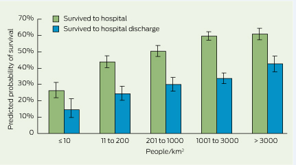 Out-of-hospital cardiac arrest (OHCA) remains a significant national and global health problem, and is estimated to affect almost 25 000 Australians annually.1 Timely access to emergency medical service (EMS) treatment remains an integral aspect of the chain of survival, and has an important role in determining the provision and performance of EMSs across both urban and regional communities.2 Regional variation in the characteristics and outcomes of OHCA has been described internationally, although few authors have examined the contribution of population density on their reported outcomes.