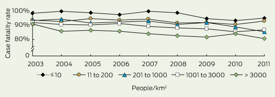 Design, setting and participants: Data were extracted from the Victorian Ambulance Cardiac Arrest Registry for all adult OHCA cases of presumed cardiac aetiology attended by the emergency medical service (EMS) between 1 January 2003 and 31 December 2011. Cases were allocated into one of five population density groups according to their statistical local area: very low density (≤ 10 people/km2), low density (11–200 people/km2), medium density (201–1000 people/km2), high density (1001–3000 people/km2), and very high density (> 3000 people/km2).