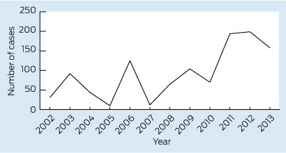 Measles notifications in Australia have been trending upwards in the past few years (Box). Of the 37 Victorian cases notified in 2013, 16 were imported cases and 20 were secondary or tertiary cases linked to an overseas-acquired case. None of the Victorian patients with notified cases were known to be fully vaccinated. The most common countries of acquisition were Indonesia and Thailand (Victorian DOH, unpublished data, April 2014). From January to May 2014, 209 cases have been notified in Australia, with all states and territories apart from Tasmania reporting cases. This already exceeds the highest number of cases reported per year in Australia since 1999.