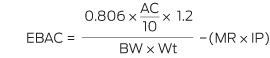 where AC is the alcohol content (g) of a standard 125 g slice of Christmas pudding, BW is the body water constant (0.58 for men and 0.49 for women), Wt is body weight (kg), MR is the metabolism constant (0.017) and IP is ingestion period (min).