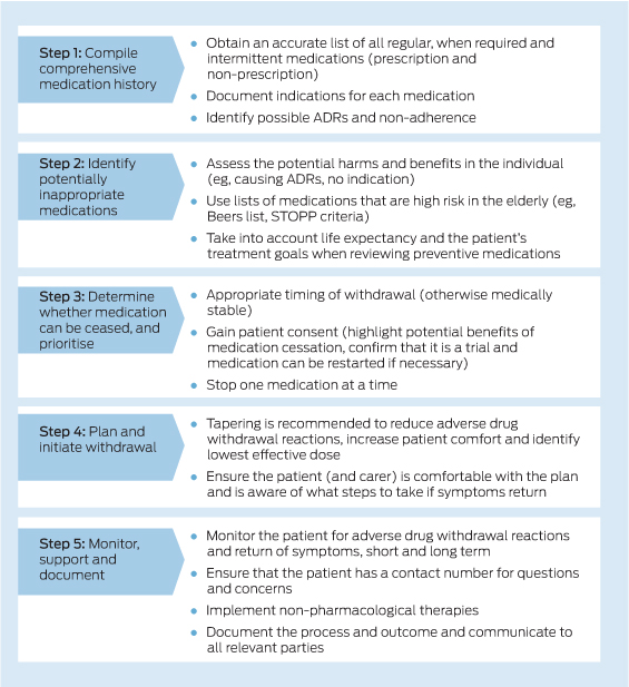 As people age there tends to be an increase in their number of comorbidities and, consequently, an increase in the number of medications they take. With Australia's ageing population, concerns regarding polypharmacy, such as increased risk of adverse drug reactions (ADRs) and financial costs, are set to rise.1 While polypharmacy is appropriate in many individuals, up to 60% of older people are exposed to inappropriate medication use (IMU; ie, use of a medication when the harms outweigh the benefits in an individual). Medications that may initially have been appropriately prescribed can, with ageing and new medical conditions, become inappropriate.2 Evidence to date indicates that ceasing use of medication is at least as complicated as initiating treatment, and the term “deprescribing” was coined to describe the complex process that is required.1 Deprescribing has the potential to greatly improve health outcomes through stopping or reducing the dose of inappropriate medications; but, currently, concrete evidence regarding its effect is equivocal. In addition, deprescribing is not free from harm, and the potential adverse consequences of medication withdrawal must therefore be considered.