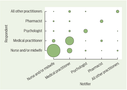 Among 697 notifications for which it was possible to determine the profession of the notifier and the respondent, the profession of the notifier and respondent was the same in 80% of cases (557/697). This concentration of intraprofessional notifications is depicted in Box 4 by the diagonal line of relatively large bubbles running from the bottom left to the top right of the figure. Nurse-on-nurse notifications (those involving nurses and/or midwives) and doctor-on-doctor notifications accounted for 73% (507/697) of notifications.