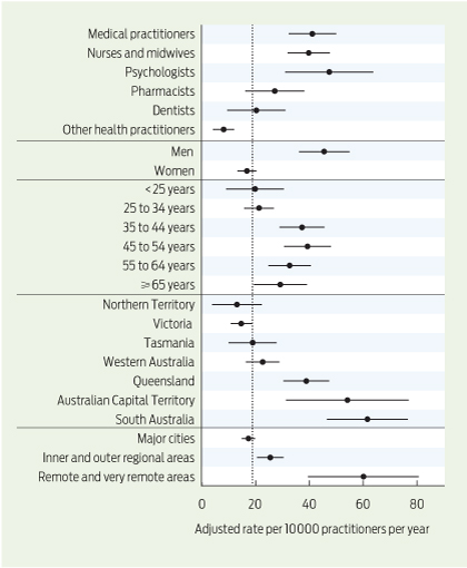 The incidence of notifications against men was more than two-and-a-half times that for notifications against women (45.5 v 16.8 reports per 10 000 practitioners per year; P < 0.001). Health practitioners working in remote and very remote areas had a much higher incidence of notification than those in major cities and regional areas (60.1 v 17.4 and 25.5 reports per 10 000 practitioners per year). There were also large differences in incidence of notifications across jurisdictions, ranging from 61.6 per 10 000 practitioners per year in South Australia to 13.1 per 10 000 practitioners per year in the Northern Territory.