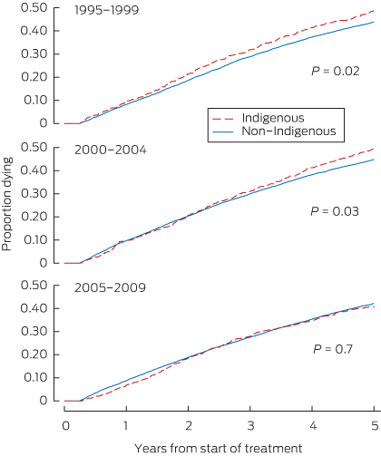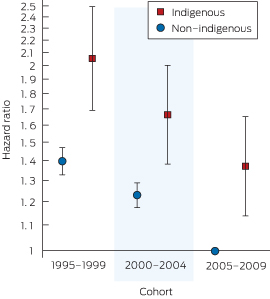 A Cox PH model including only the main effects and interaction term between cohort and Indigenous status showed a small increase in the hazard ratio for death for Indigenous compared with non-Indigenous patients in earlier cohorts but no difference in the 2005–2009 cohort (Appendix 2). A dramatically different picture emerged once age was added to the model, with a greatly increased hazard ratio for Indigenous patients in all cohorts (Appendix 2). This second model also shows higher mortality rates for earlier cohorts compared with the 2005–2009 cohort of non-Indigenous patients.