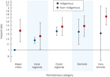 The Indigenous–remoteness interaction terms are highlighted in Box 6. Although non-Indigenous patients from major capital cities had a lower hazard than non-Indigenous patients from other regions, this was not the case for Indigenous patients (Box 4); however, the remoteness category interaction terms were not significant overall (χ2 = 6.17; df = 4; P = 0.2).